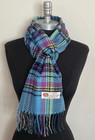 100% Cashmere Scarf Plaid Blues / Purple / Lime Made In England Warm Wool Wrap