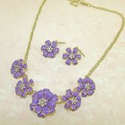 Purple Flower Necklace And Earring Set With Enamel And Clear Crystal - New