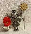 Vintage Lady Gardener Rhinestone Flower Pewter Figural Signed Danecraft Brooch