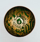 Vintage Enamel On Copper Small Footed Bowl Trinket Dish W Gold & Green & Red 3"