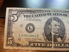 1965 B Five Dollar Federal Reserve Note. Yellow Dye Error On Back.