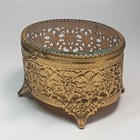 Vintage Ormolu Filigree Round Casket Jewelry Trinket Box Beveled Glass