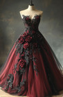 Gothic Black Burgundy Wedding Dress V Neck Flowers Applique A Line Bridal Gown