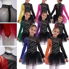 Kids Ballet Dance Tutu Dress Gym Leotard Long Sleeve Shiny Rhinestone Dresses