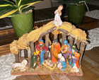 Vtg 10pc Resin Figures 18"l X 6.5"w X 12"h Nativity Set Wood Manger