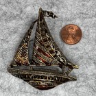 Vintage Damascene Sailboat Brooch Lapel Pin Red Black Silver Enamel Accents Rare