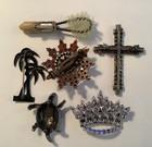 6 Vintage Lapel Pin Brooch Crown Cross Palm Garnet Turtle Sliver Multi Color Wow