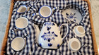 Delton Miniature Doll Ceramic Tea Set Oval Wicker Picnic Basket Blue Dolls New