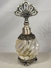 Art Deco Vtg Empty Glass Perfume Bottle Ornate Metal Crown Stopper & Footed Base