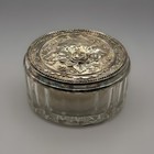Vintage Glass Body Powder Box Jar Mirror Lid W/ Puff & Screen Vanity Silver Top