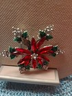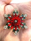 Vintage Poinsettia Flower Brooch Pin Enameled Rhinestones Christmas Holiday Euc