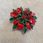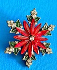 Vintge Red Green Enamel Rhinestone Poinsettia Flowers Christmas Tree Pin Brooch