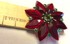 Red & Green Poinsettia Brooch With Rhinestones - Christmas Holiday Flower Pin