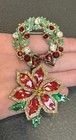 Lot Of 2 Signed Tc Poinsettia & Wreath Brooch Christmas Pin Enamel Rhinestone