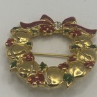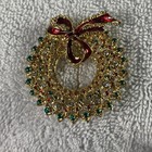 Christmas Wreath Brooch Pin Gold Tone Red Green Rhinestone Bow Holiday Sparkle