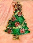 Enameled Green Christmas Tree With Flowers Brooch Box Included