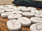 Vtg 24 Pc White Ceramic Rune Stone Set Ancient Norse Viking Pagan Symbols / Bag