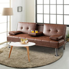 Modern Brown Faux Leather Futon Sofa Bed, Convertible Couch With Cup Holders