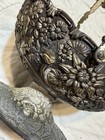 Vintage Silver Plate Embossed Floral Footed Basket Swing Handle Made In Japan
