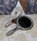 Vintage Silver Plate Heavy Ornate Floral Vanity Hand Mirror& Brush Antique 9”x5”