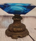 Vintage Metal Pedestal Base Dreamy Blue Glass Ashtray