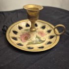 Vintage Brass Chamber Stick | Cloisonné Candle Holder | Enameled Flower Motif