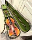 Vtg /antique 1/8 Violin W/bow & Deco Hinge Case Germany Stamp Neck & Bow Student