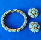 Hattie Carnegie Vintage Gold Tone Blue Glass Rhinestone Hinged Bracelet+earrings