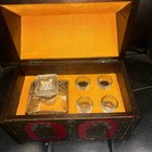 Vintage Amber Glass Liquor Decanters & Shot Glasses Wood Chest Bar Set