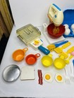Lot Vintage Toy Food Can Plastic Toaster Utensils Cooking Pots Pans Play Kitchen