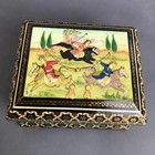 Vintage Persian Khatam Kari Marquetry Trinket Box Hand Painted Polo Scene Inlay