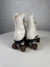 Vintage White Roller Skates Chicago Plates Metal Case Derby Wood Wheels Sz 7 1/2