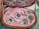 Vtg 11 Piece Child's Snowman Porcelain Tea Party Set In Wicker Picnic Basket