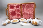 Vintage Teddy Bear Child Tea Set Wicker Picnic Basket Porcelain Mini Tea Set Red