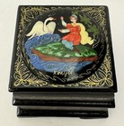 Vintage Russian Mini Trinket Box Black Lacquer Wooden Hand Painted Signed