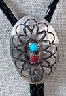 Vintage Navajo Sterling Silver Turquoise & Coral Stamped Oval Bolo Tie