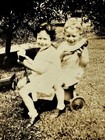 Vintage Snapshot Two Children Toy Wagon Ukulele Guitar Kids Yard Photo 1930s