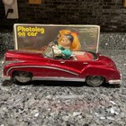 Vintage Battery Operated Tin Litho Car Red Photoing On Car Me630 W/ Box As Is