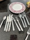 Vintage Toy Dish Set Lot Plates Cups Utensils Pitcher Unmarked W/ Toy Iron