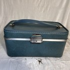 Vintage Blue Vinyl Train Case Vanity Cosmetic Makeup Box Mirror Lock Keys Lining