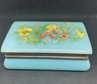Vtg Jewelry Box / Vanity Trinket Blue Hinged Brass Floral Painted Trinket Box