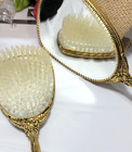 Vintage Vanity Mirror & Hair Brush Set Floral Gold Tone Removable Bristles