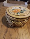 Vintage Woven Wicker Straw Sewing Round Basket Box W/ Raffia Floral Embroidery