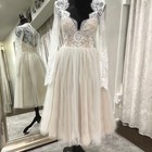 Champagne Short Wedding Dresses With Long Sleeves Lace Tea Length Bridal Gowns