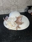 Preston York Creme Straw Kentucky Derby Dress Hat W/ Feathers + Ribbon Flowers