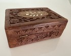 Vtg Wooden Box Hand Carved Jewelry Trinket Jungle Sheesham Wood Inlay Hinged Lid