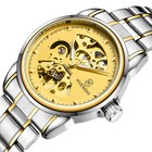 Classic Men's Gold Dial Skeleton Black Leather Mechanical Sport Army Wrist Watch